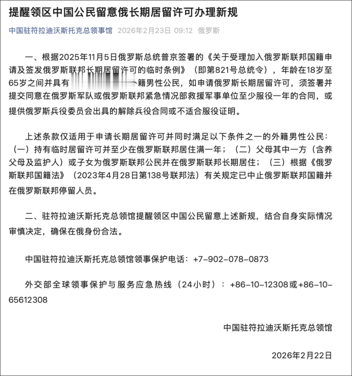 二、驻符拉迪沃斯托克总领馆提醒领区中国公民留意上述新规,结合自身实际情况审慎决定,确保在俄身份合法。
